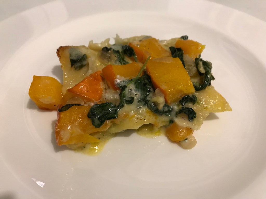 Warum? Kürbisse enthalten viel Beta-Carotin, eine Vorstufe von Vitamin A), Vitamin C und E, die alle antioxidativ wirken. Außerdem die wichtigen Mineralien Kalium, Magnesium, Kalzium und Eisen, u.a. wichtig für den Muskel- und Knochenstoffwechsel und die Blutbildung. Nicht zuletzt hat der fasrige Kürbis reichlich Ballaststoffe, die Darmkrebs vorzubeugen helfen. Spinat ist zwar nicht der ganz große Eisenlieferant, wie behauptet wurde, aber wenig Eisen, Kalium, Kalzium, Magnesium sind es auch nicht. Und er bringt neben Vitamin C auch B-Vitamine mit, die wichtig für die Funktion der Nervenzellen und die Blutbildung sind. Für das notwendige Eiweiß ergänzen wir diesmal Gorgonzola. Und natürlich fehlt auch mein geliebtes Olivenöl nicht.