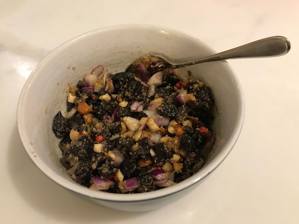 Kürbis und Kürbiskerne sind besonders reich an Antioxidantien, allen voran Beta-Carotin, liefert wertvolle Mineralstoffe wie Kalium, Magnesium, Kalzium und Eisen sowie jede Menge Ballaststoffe. Auch Trockenpflaumen sind ballaststoff- und mineralienreich; zusätzlich enthalten sie eine Menge Vitamin E, das oxidativen Stress reduziert. Haselnüsse glänzen ebenfalls mit Vitamin E und vielen Mineralien (u. a. Kalzium, Magnesium, Phosphor, Eisen und Zink), enthalten aber zusätzlich noch viele ungesättigte Fettsäuren, B-Vitamine und sie sind ein guter Proteinlieferant. Rote Zwiebeln ergänzen weitere Antioxidantien, B-Vitamine und Vitamin C. Olivenöl mit seinen vielen ungesättigten Fettsäuren trägt zur Senkung von Blutdruck und Cholesterinspiegel bei.
